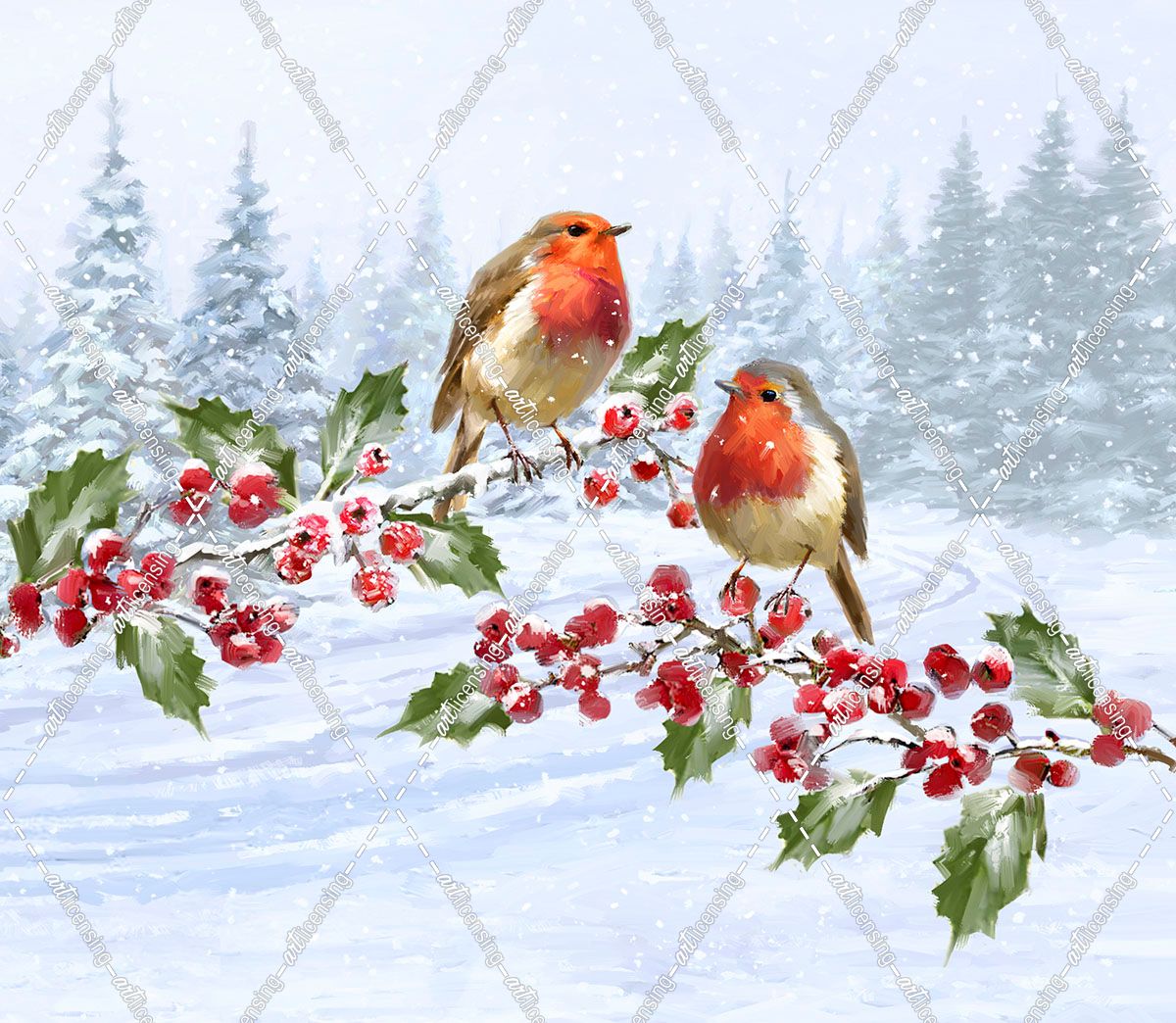 1610 Robin Pair on Holly Branch