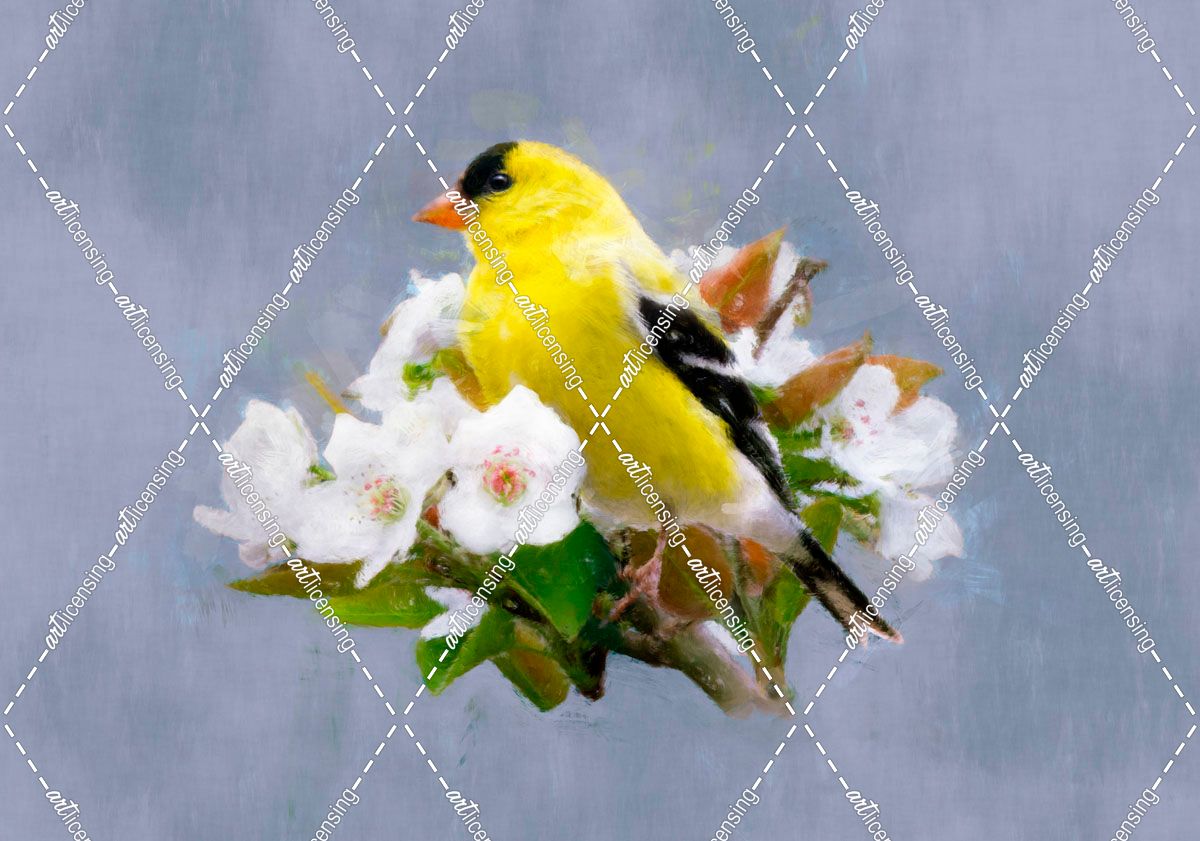 American Goldfinch in a Blossoming Pear Tree