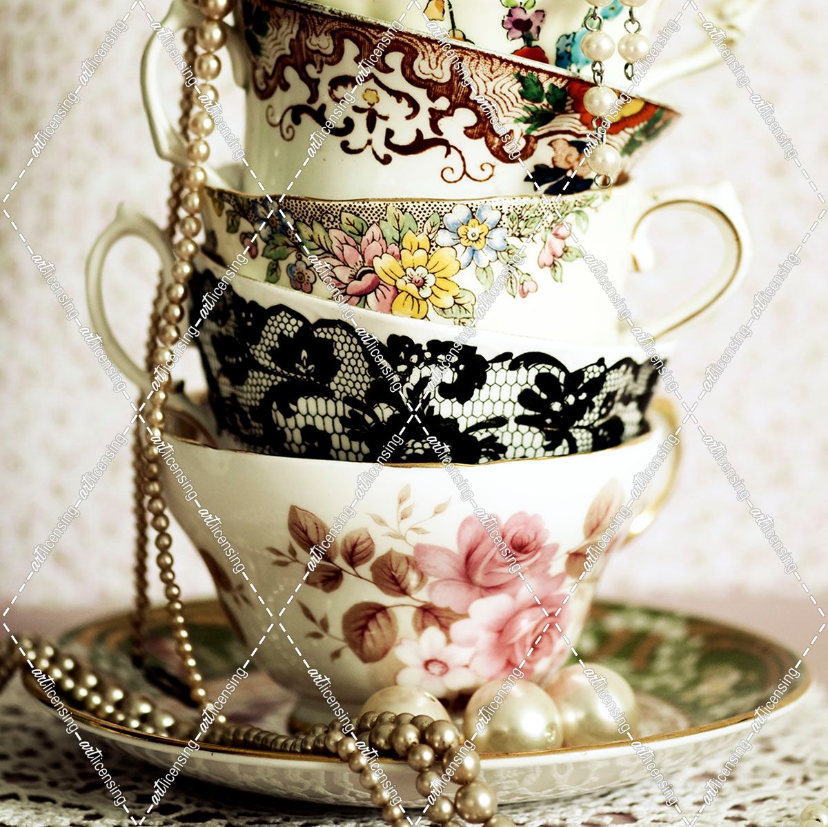 Antique Cups and Saucers with Pearls 01