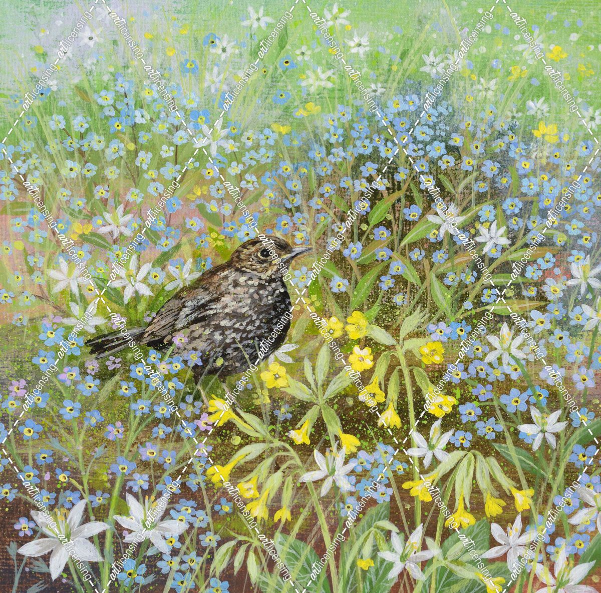 Baby Blackbird and Forget-me-nots