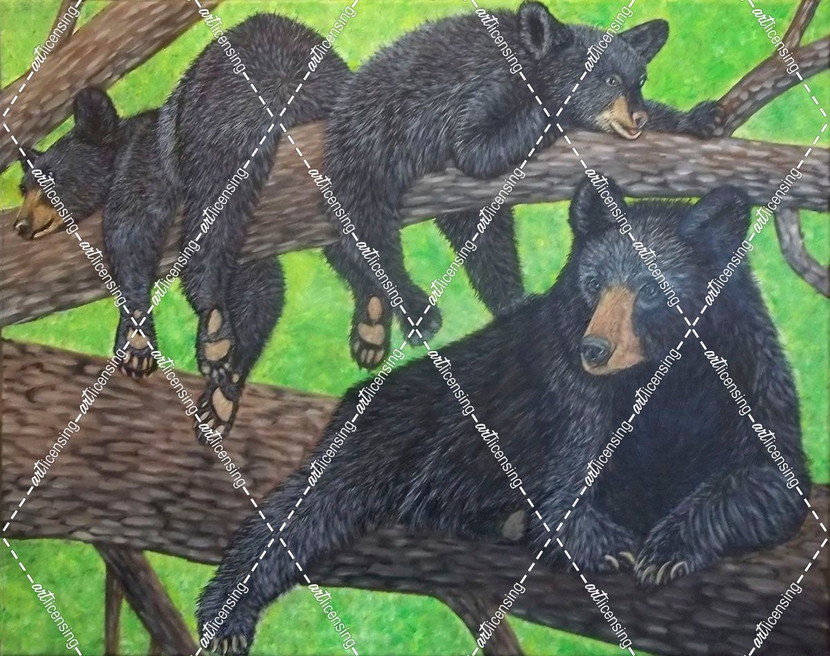 Black Bear And Her Cubs On A Tree