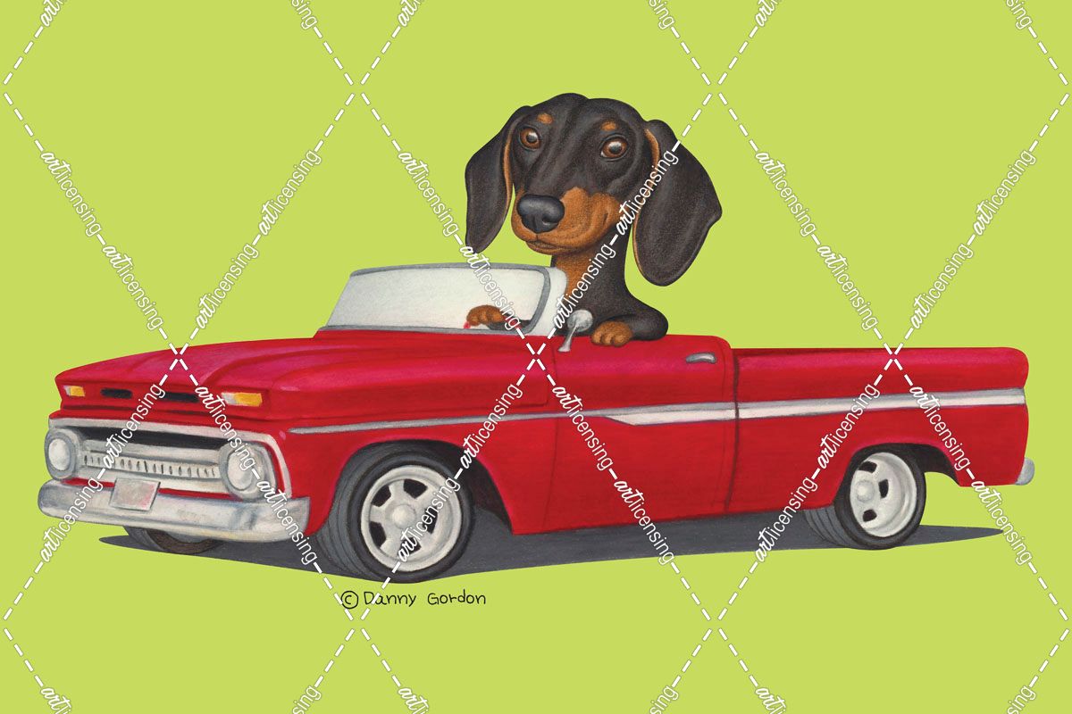 Black Dachshund in Red Truck