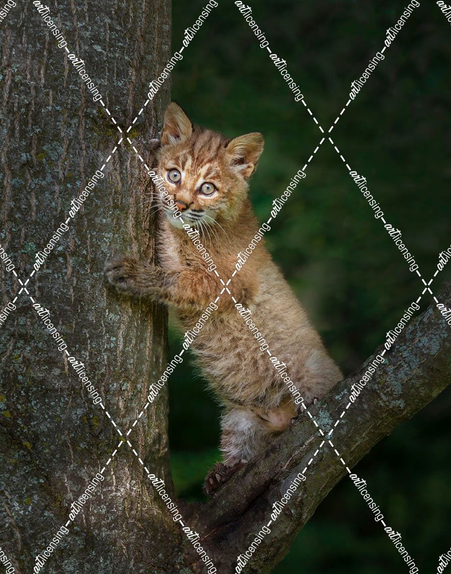 Bobcat Kitten Poses Against Tree Trunk