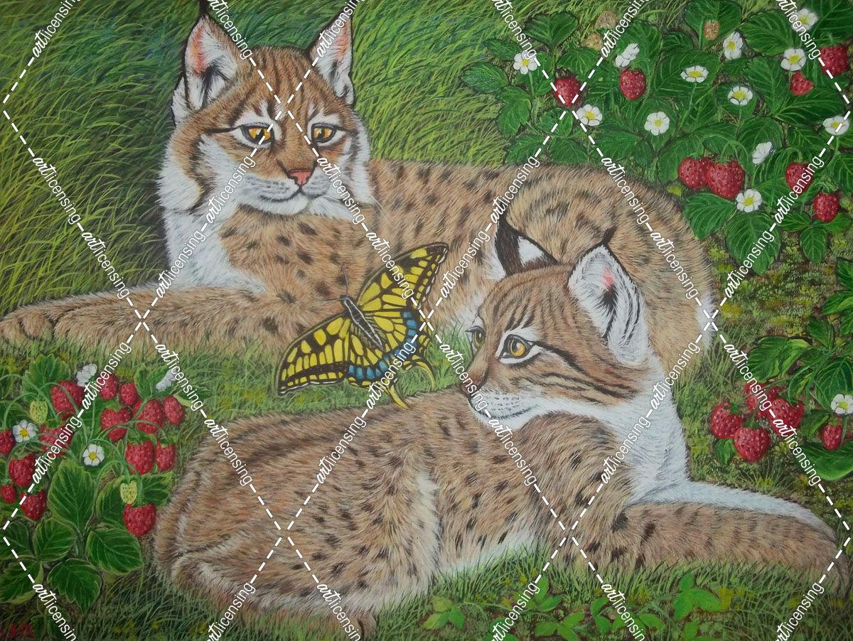 Bobcat Kittens With A Butterfly Among Wild Strawberries