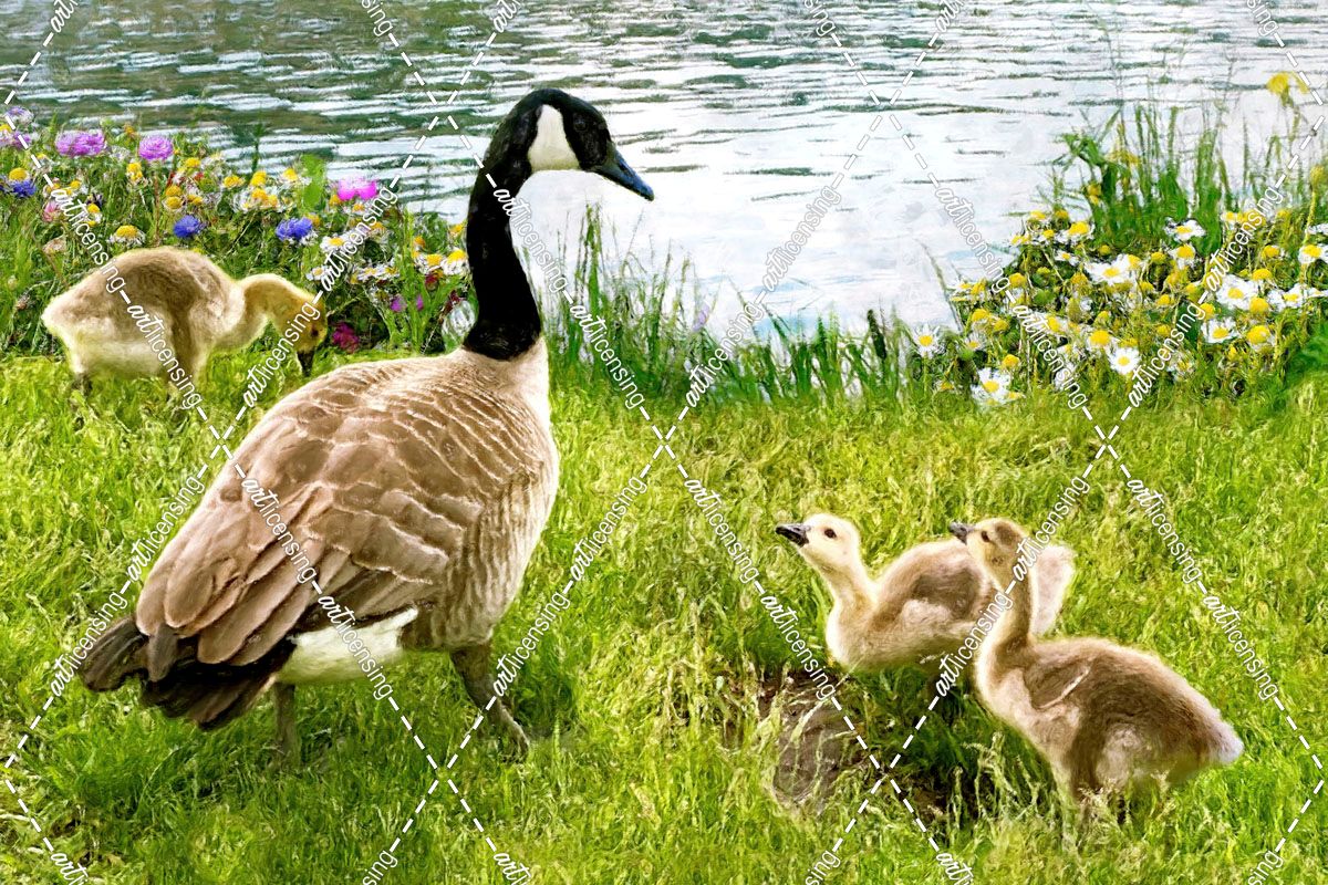 Canadian Goose and Goslings on a Riverbank