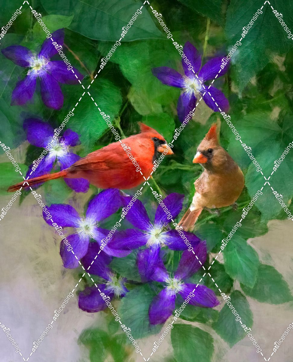 Cardinals On A Blooming Clematis