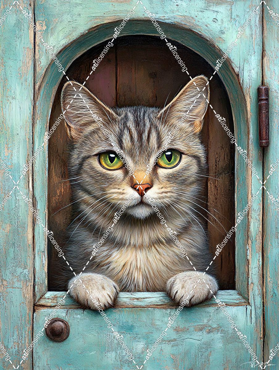 Cat Standing At The Blue Door