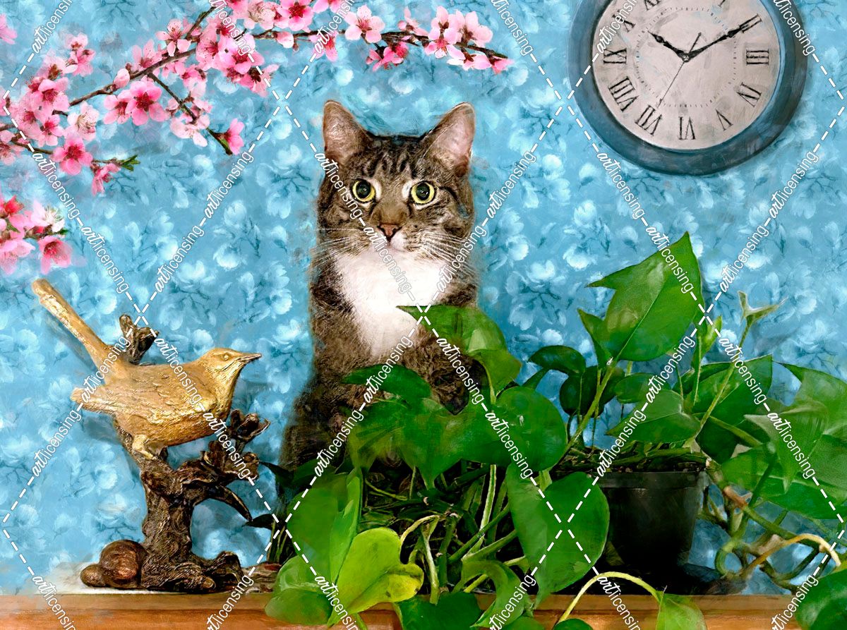 Cat Still Life With Bird Figurine
