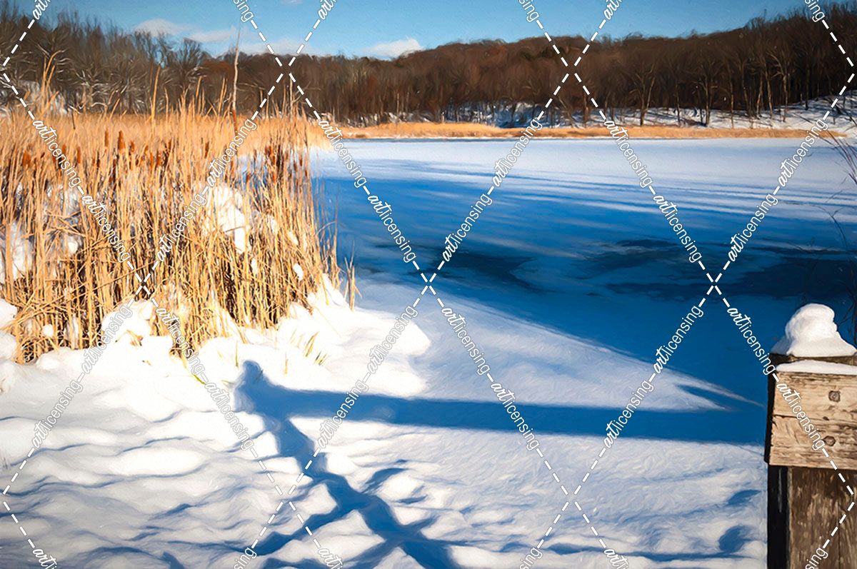 Cattails And Post  In Snow Along Pond