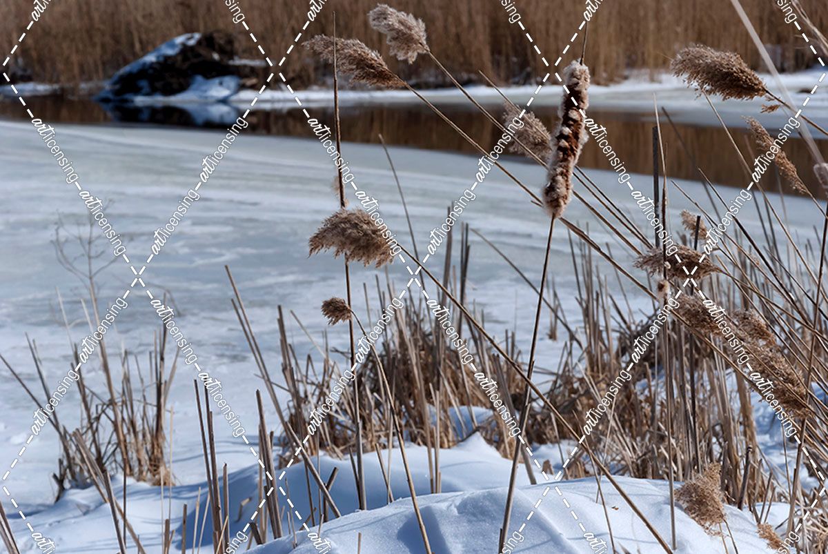 Cattails In Snow With Pond