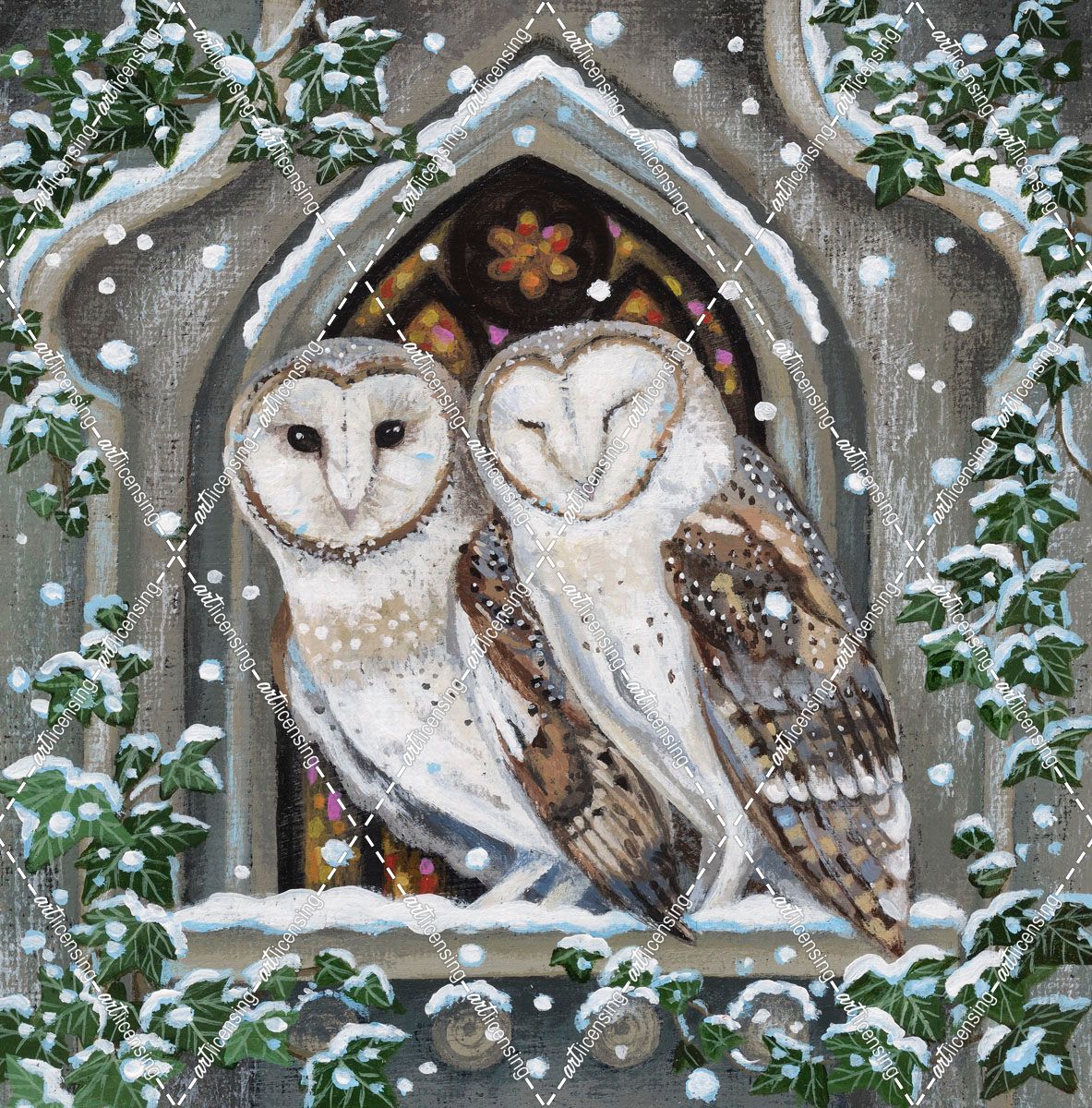 Church Window And Owls