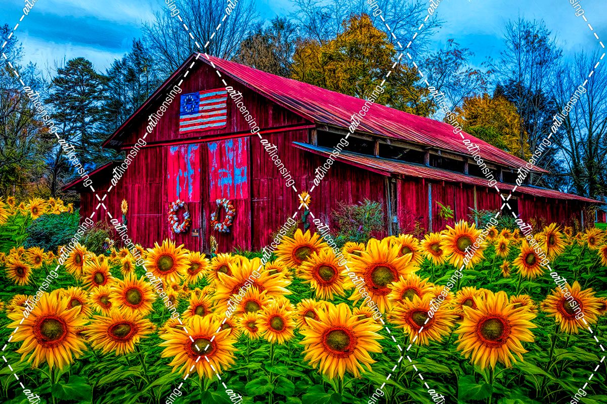 Country Barn in Sunflowers