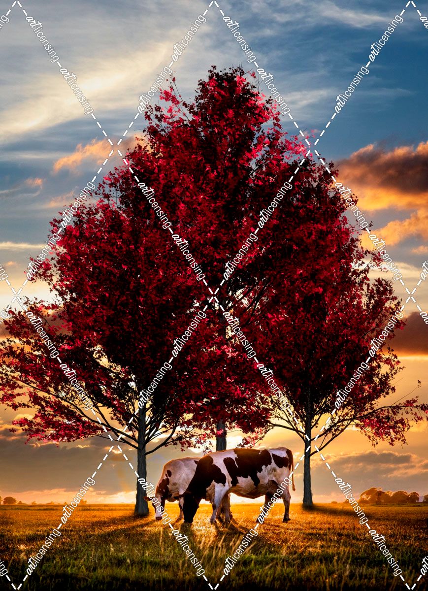 Cows in Sunset Light Under the Trees