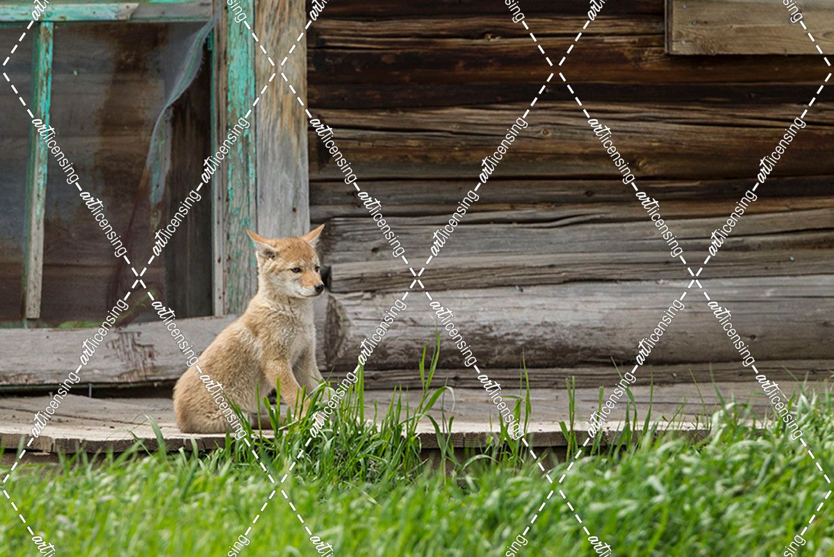 Coyote By Log Cabin Door