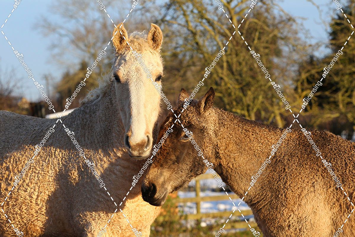 CQ2R7657BashkirCurlyMare&YoungsterInTheSnow,ButtsFarm,UK