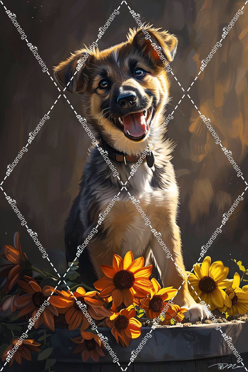 Cute Puppy With Orange Flowers German Shepherd