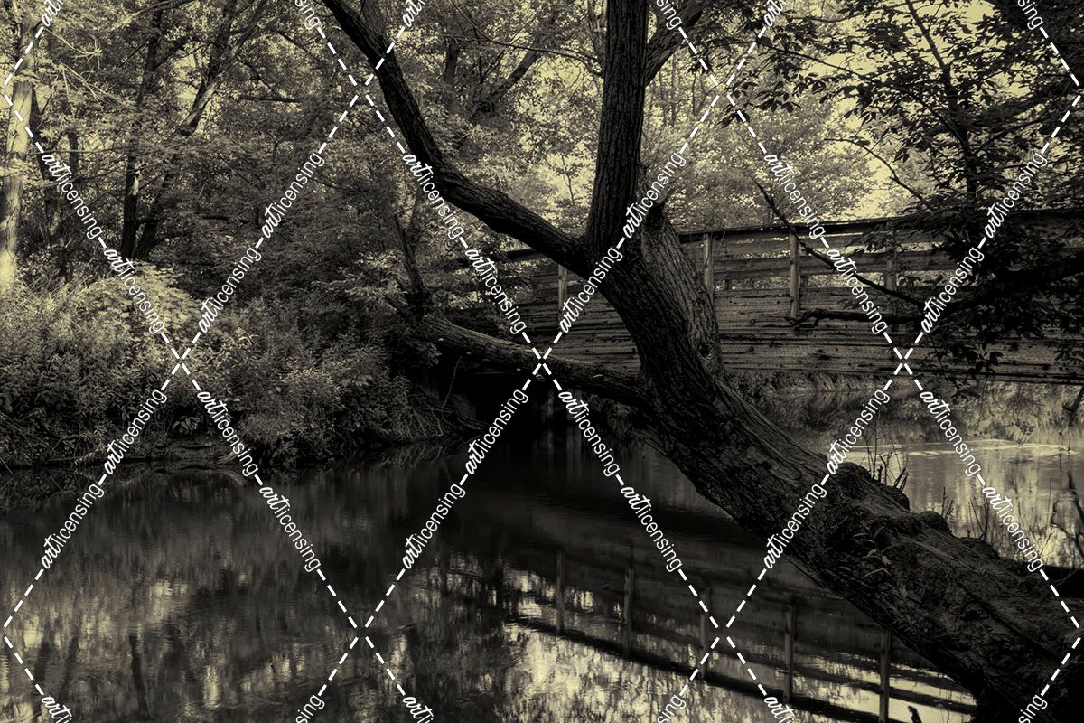 Forest with wooden bridge over brook