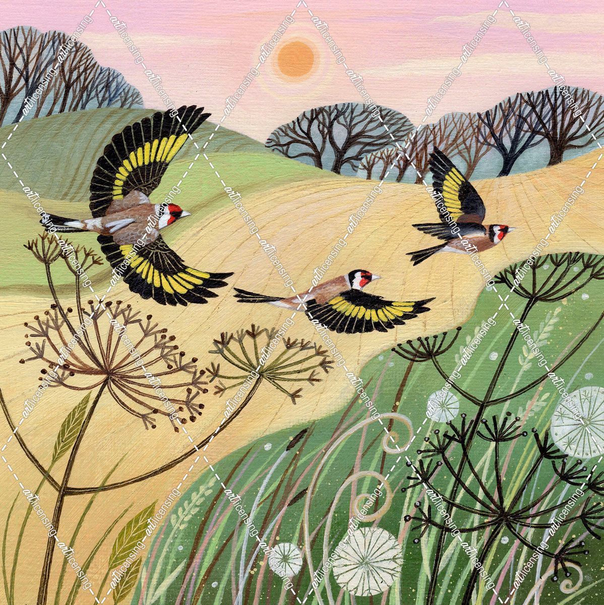 Goldfinches and Setting Sun