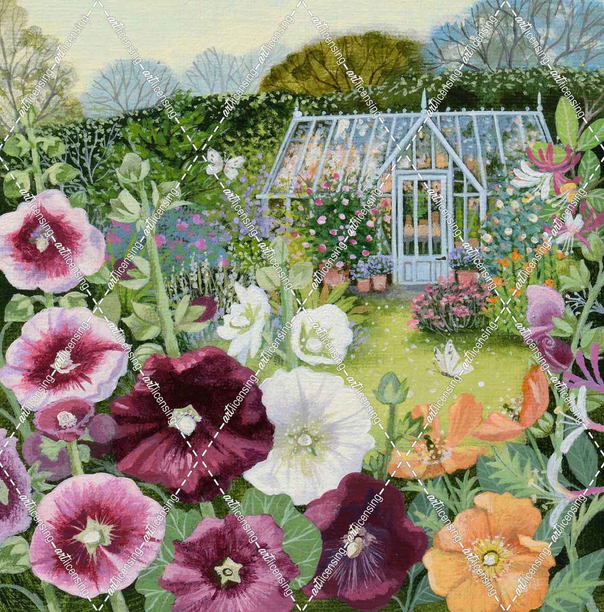 Greenhouse and Hollyhocks