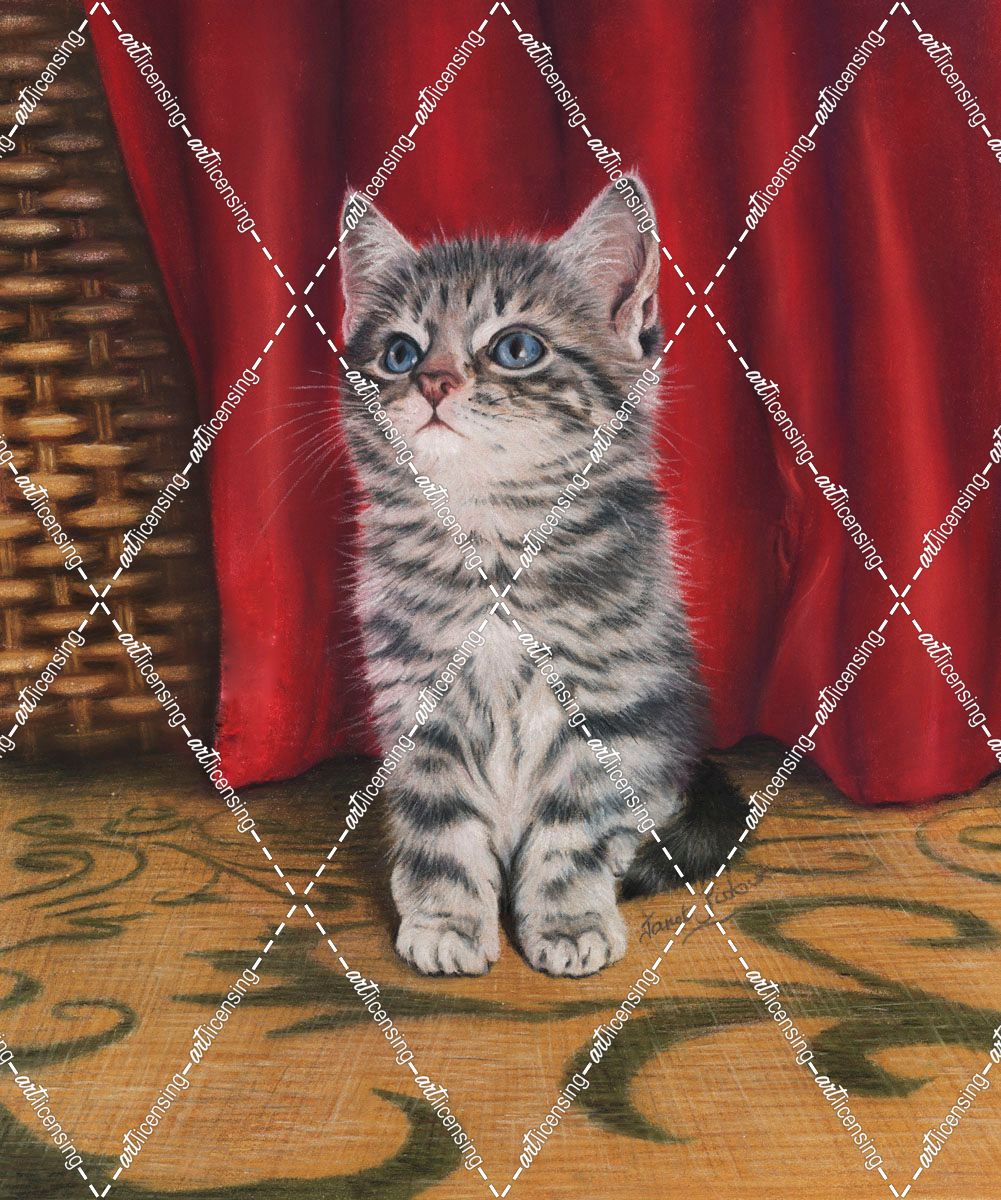 Grey Kitten And Red Curtain