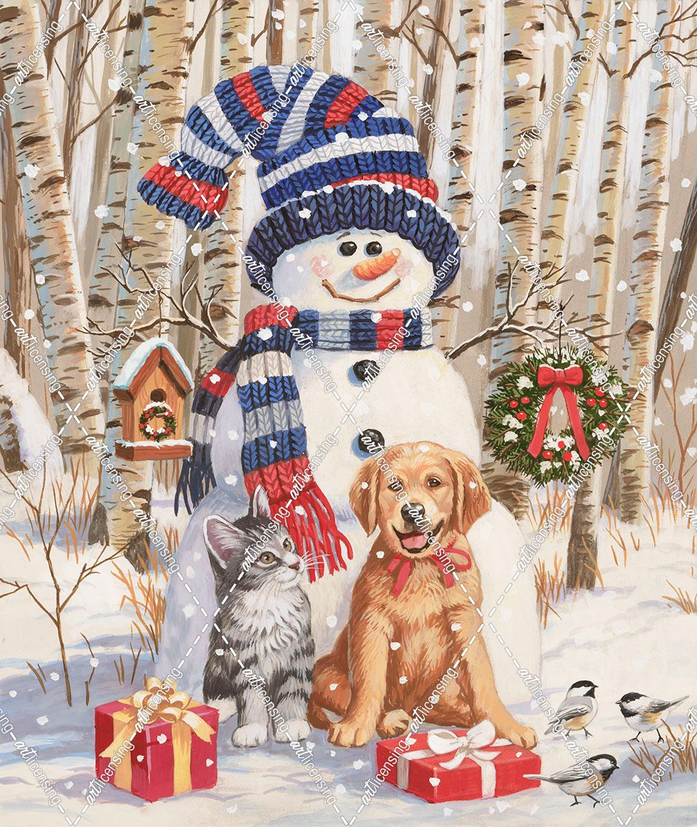 Kitten and Puppy with Snowman