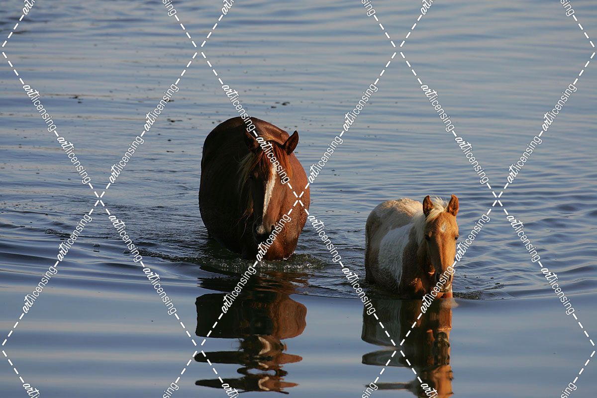 MD3P8143 Chincoteague Mare & FoalIn Water, Virginia, USA 2008