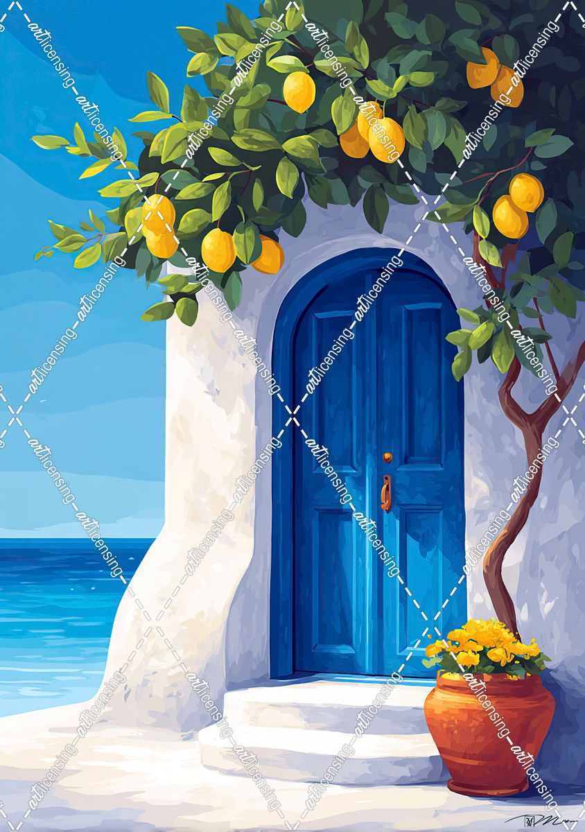Minimalist Illustration Of Blue Door On Italian Sea With Lemons (2)