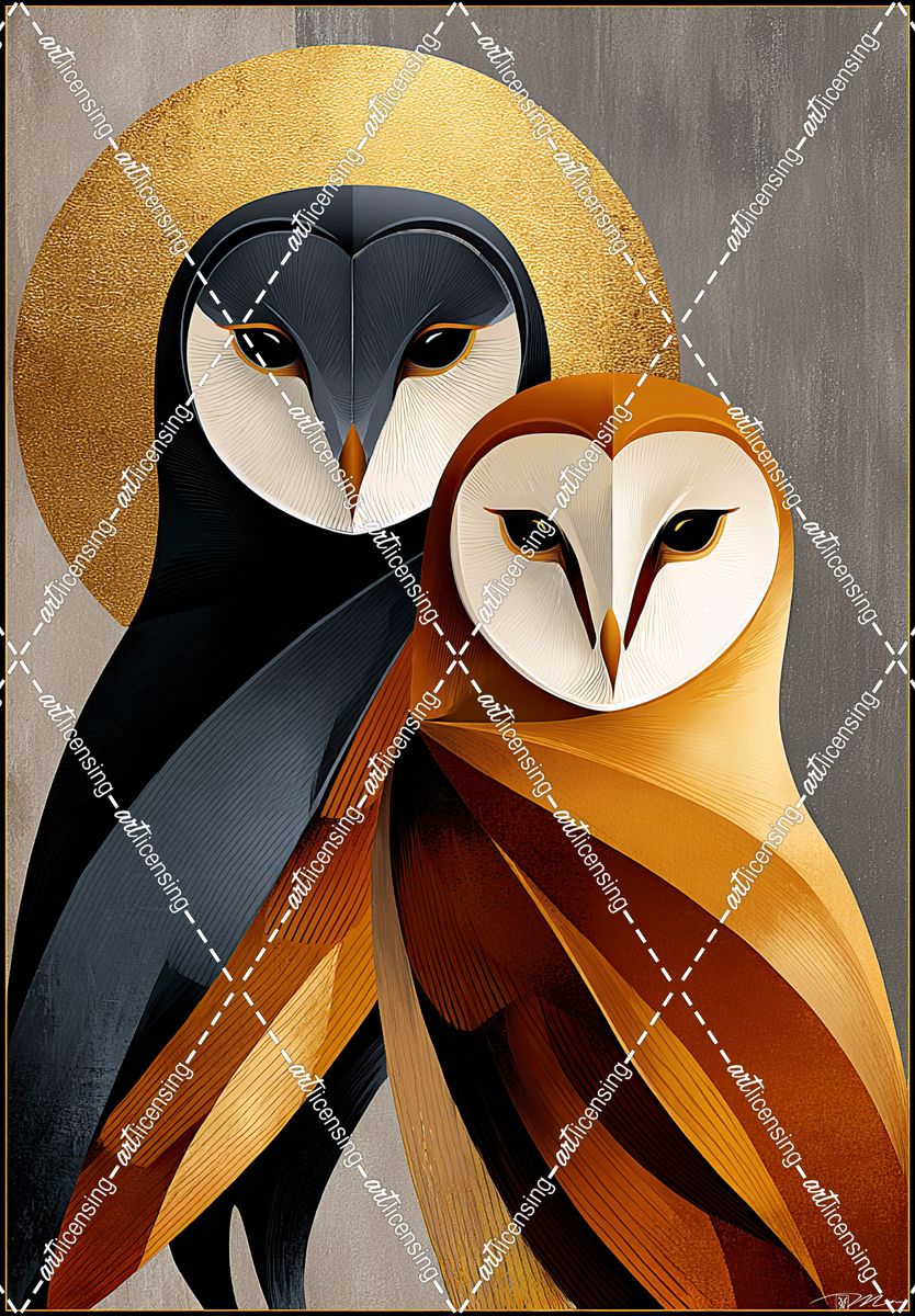 Minimalist Poster With Two Gray, Gold, And Orange Owls