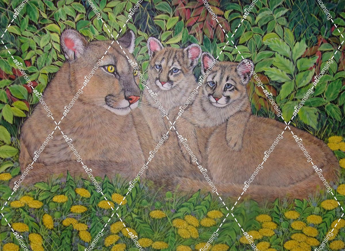 Mountain Lion With Her Cubs Among Dandelions