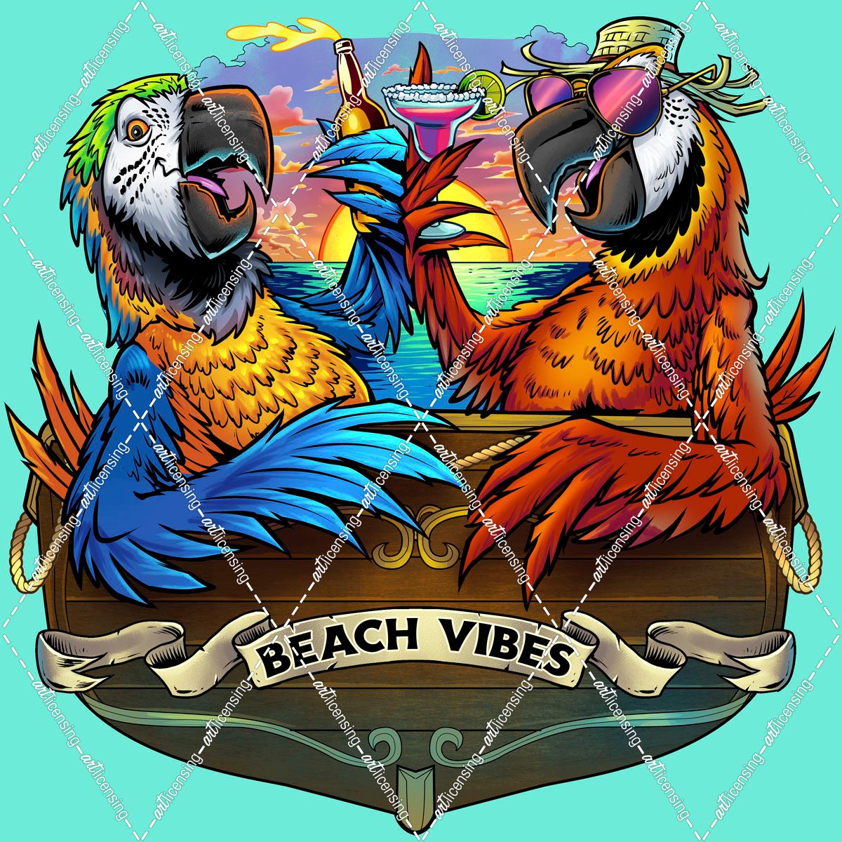 Parrots Drinking At Sunset