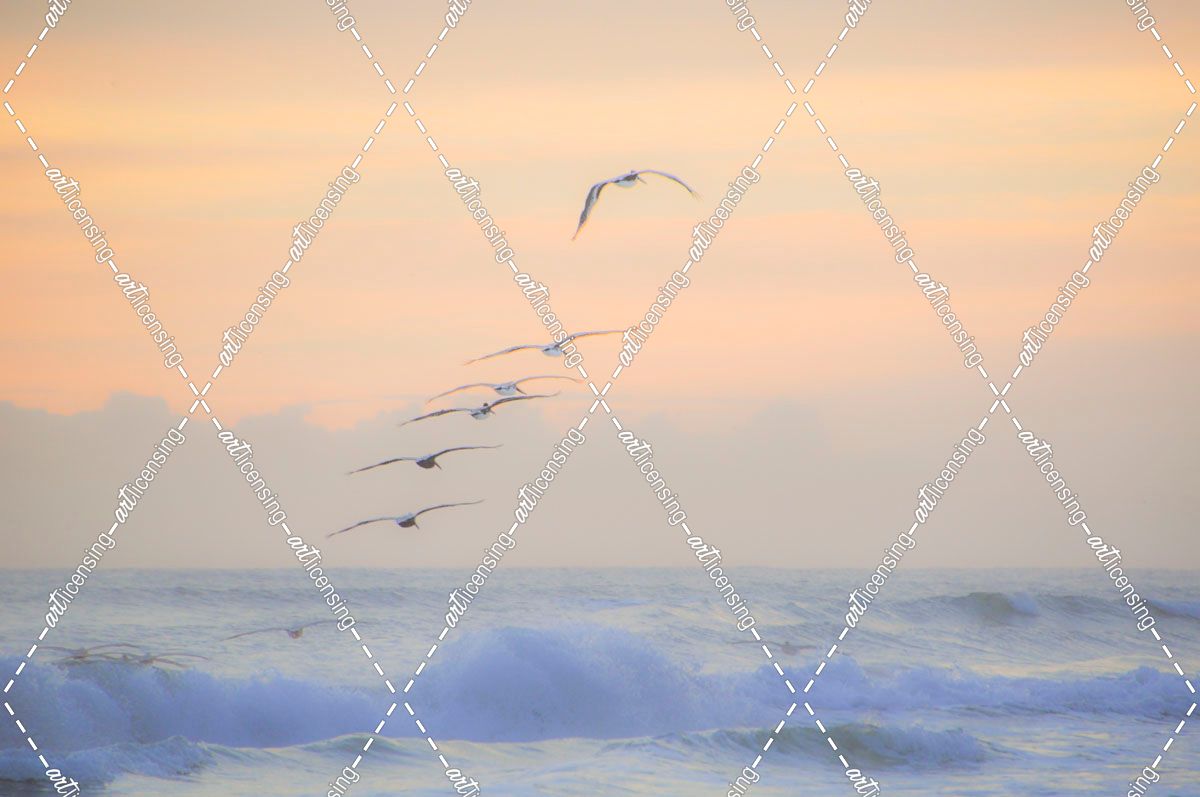 Pelicans over lavender wave