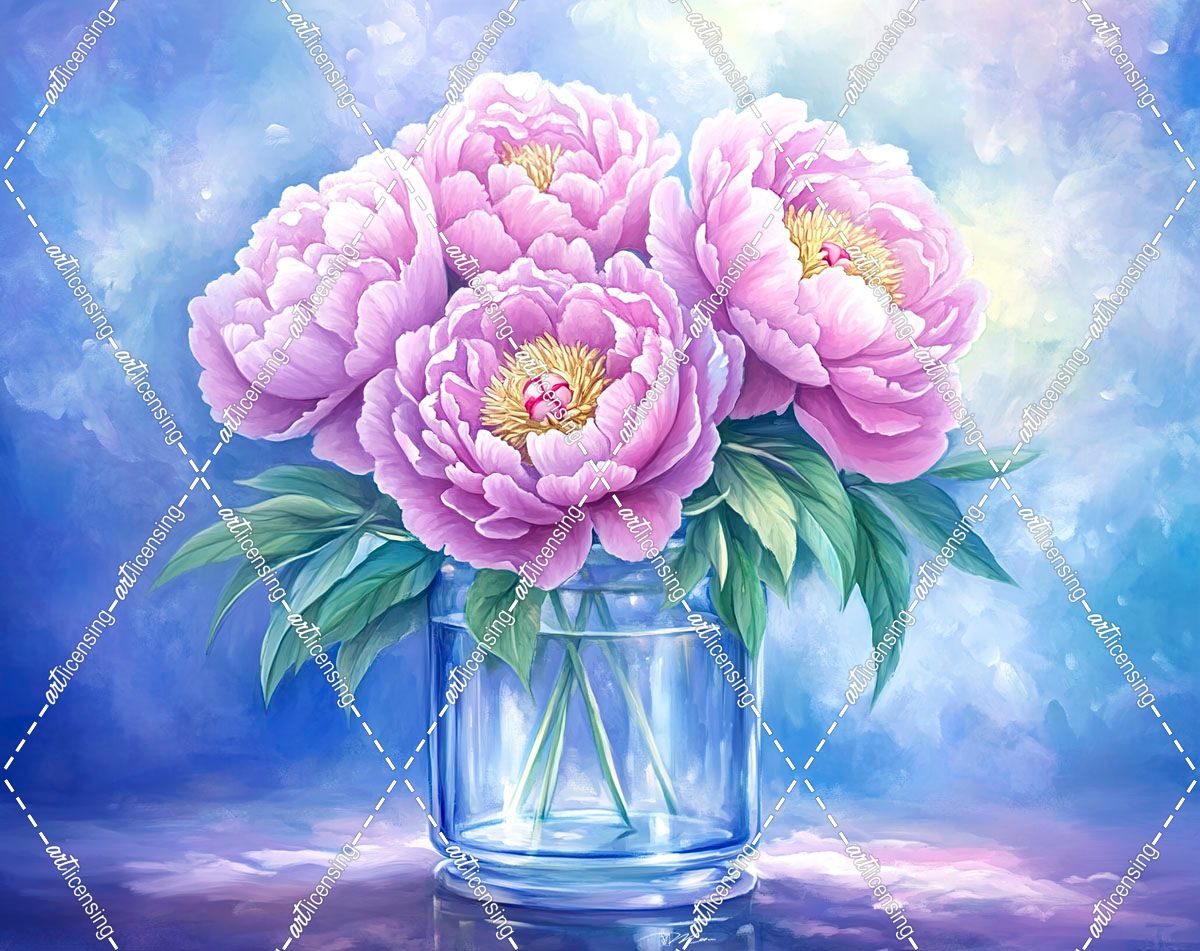 Peonies In Glass Vase Pink And Blue
