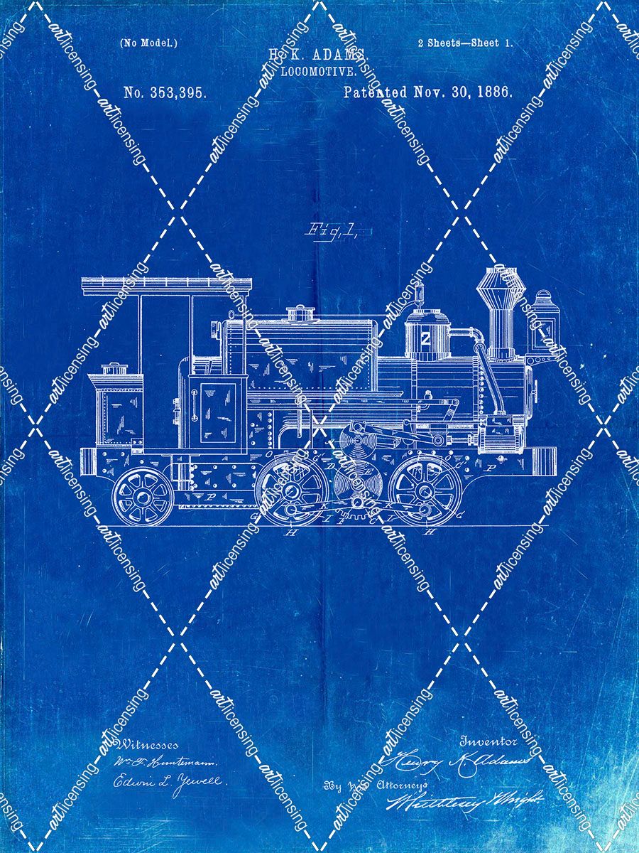 PP122- Faded Blueprint Steam Locomotive 1886 Patent Poster