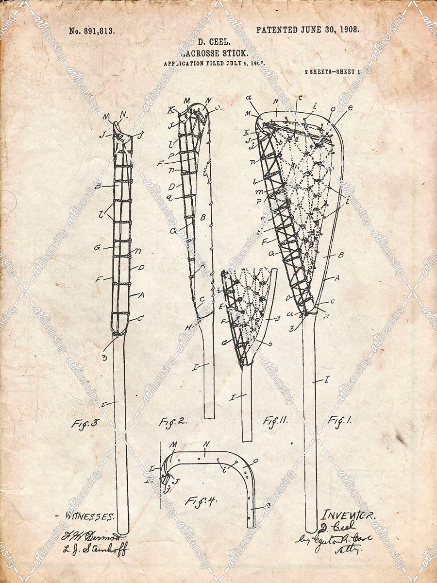PP166- Vintage Parchment Lacrosse Stick Patent Poster