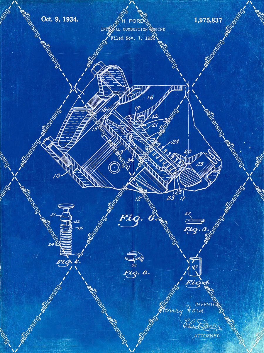 PP172- Faded Blueprint Ford V-8 Combustion Engine 1934 Patent Poster