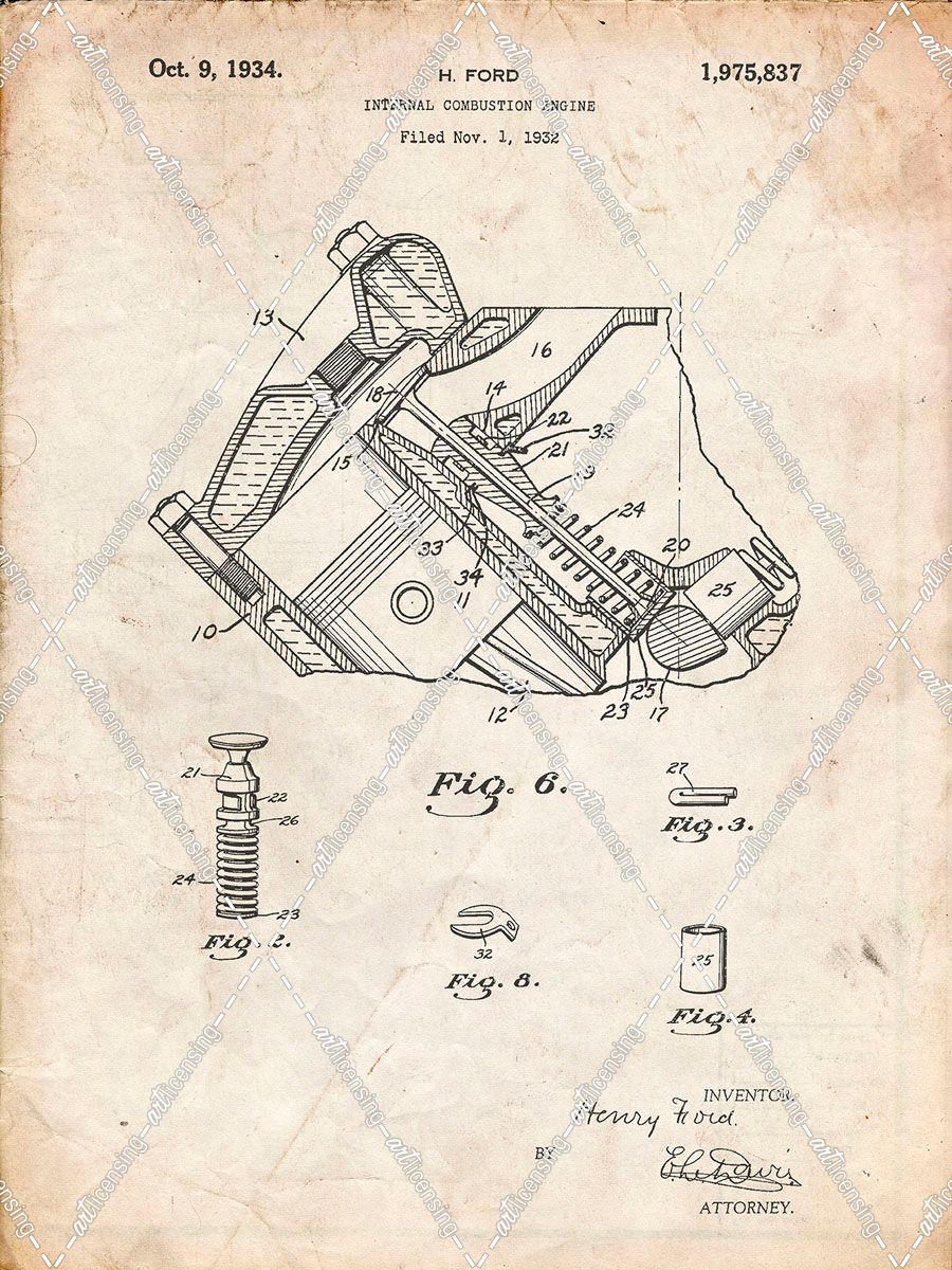 PP172- Vintage Parchment Ford V-8 Combustion Engine 1934 Patent Poster