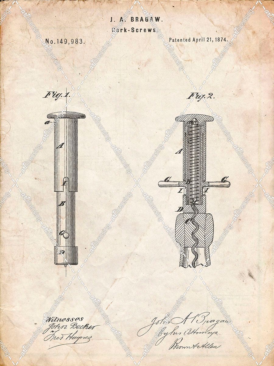 PP203- Vintage Parchment Corkscrew 1874 Patent Poster