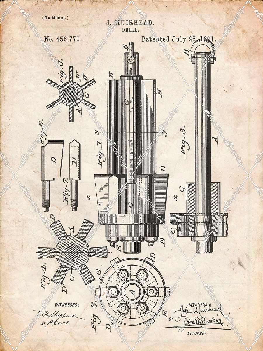 PP280-Vintage Parchment Mining Drill Tool 1891 Patent Poster