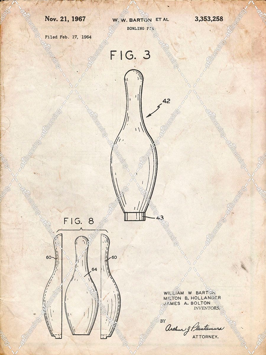 PP641-Vintage Parchment Bowling Pin 1967 Patent Poster