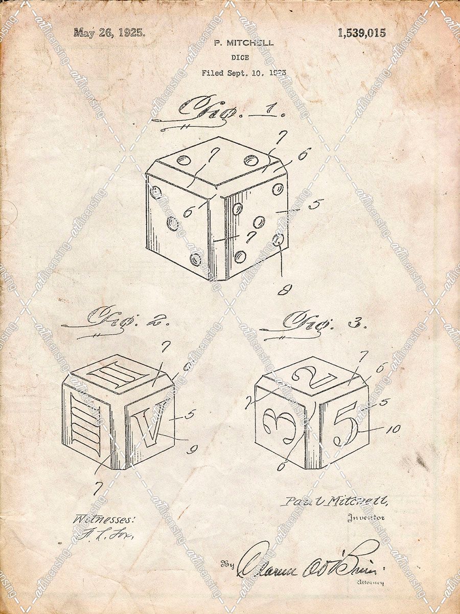PP781-Vintage Parchment Dice 1923 Patent Poster