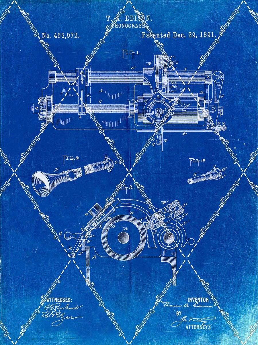 PP798-Faded Blueprint Edison Phonograph Patent Poster
