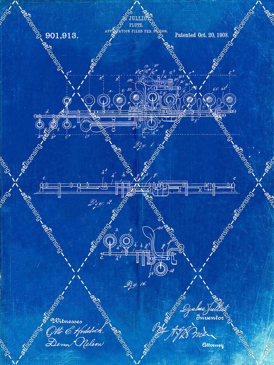PP820-Faded Blueprint Flute 1908 Patent Poster