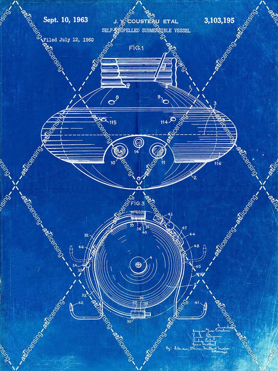 PP898-Faded Blueprint Jacques Cousteau Submersible Vessel Patent Poster