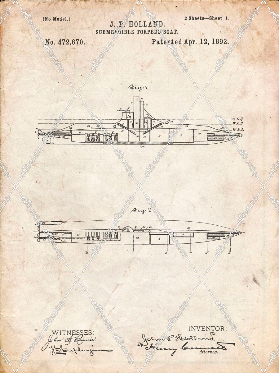 PP91-Vintage Parchment Holland Submarine Patent Poster