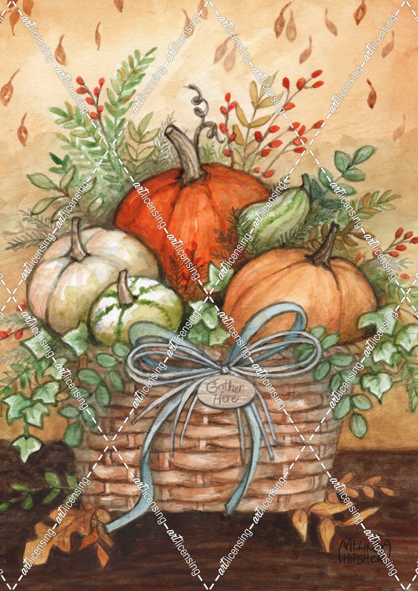 Pumpkins In Basket With Leaves In Autumn