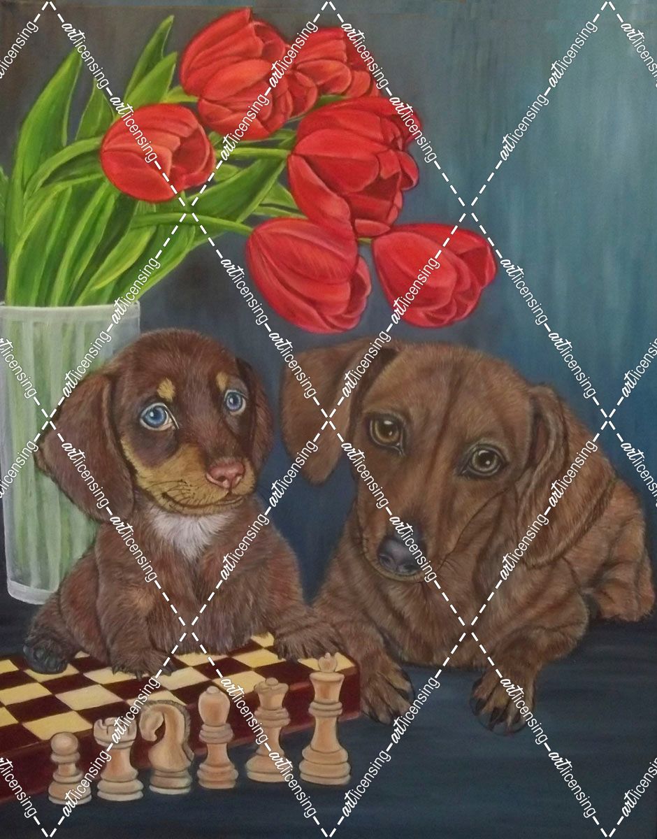 Puppies With Chess And Tulips