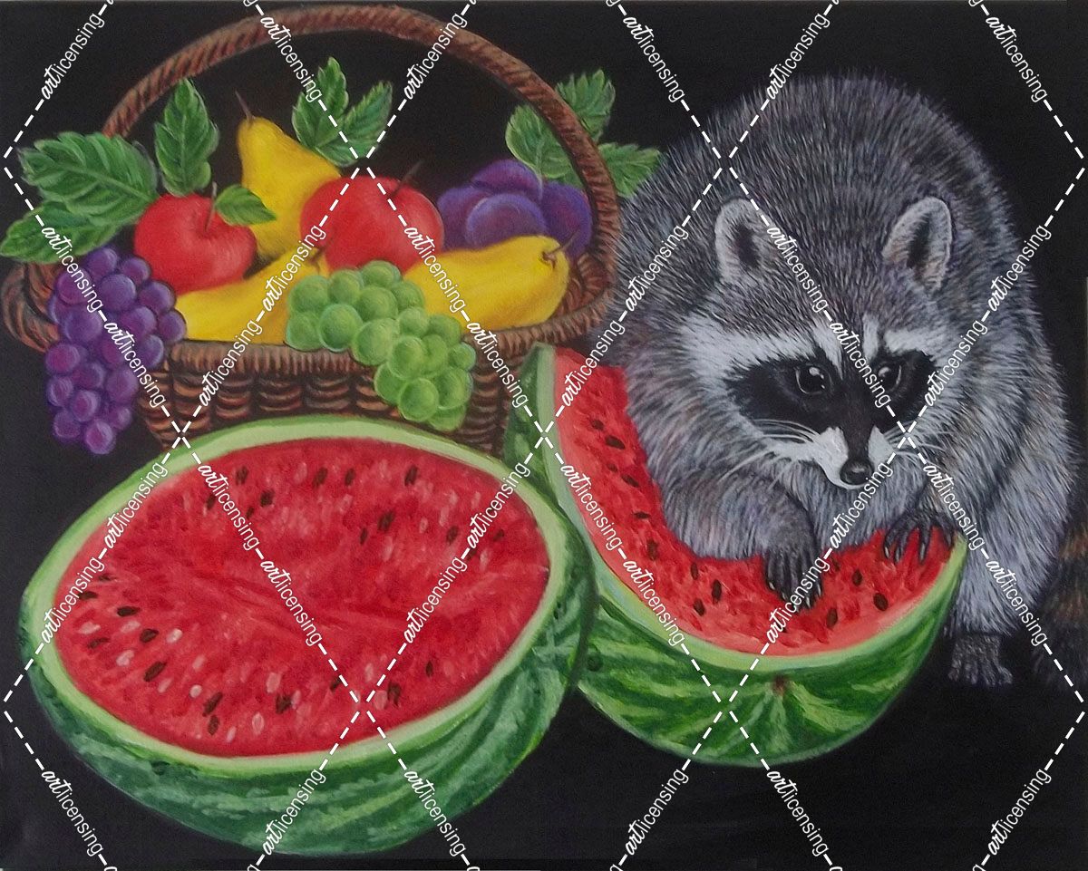 Raccoon with a watermelon and fruits