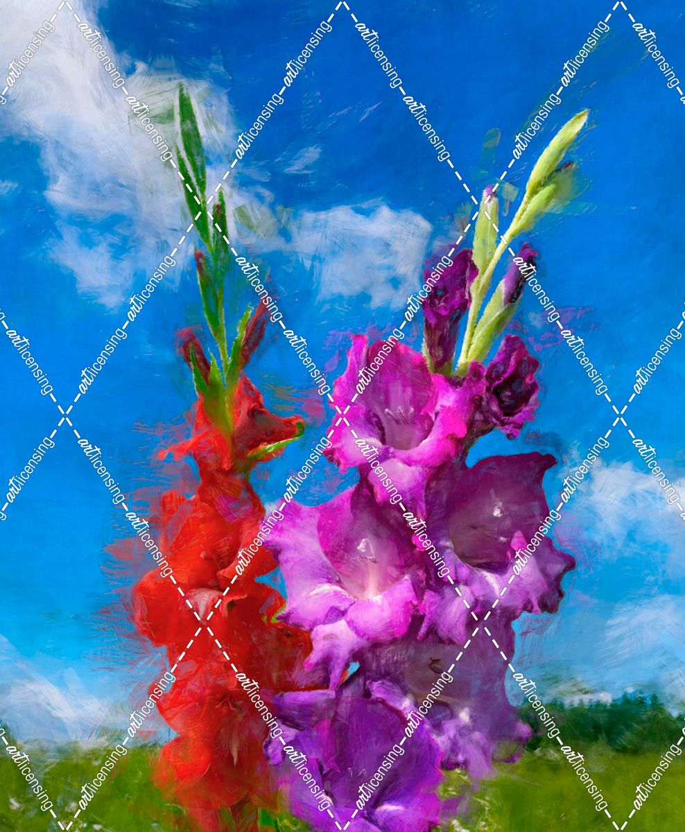 Red and Purple Gladiolus in a Summer Landscape