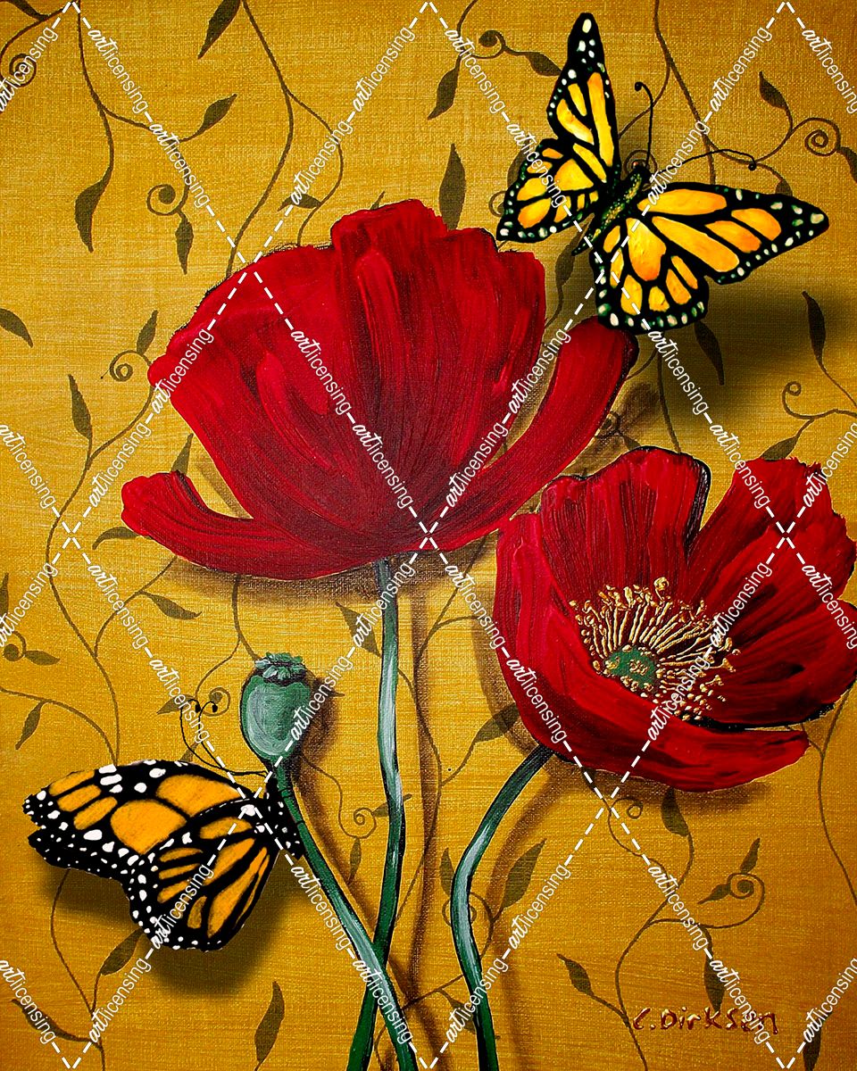 Red Poppies With Yellow Butterflies