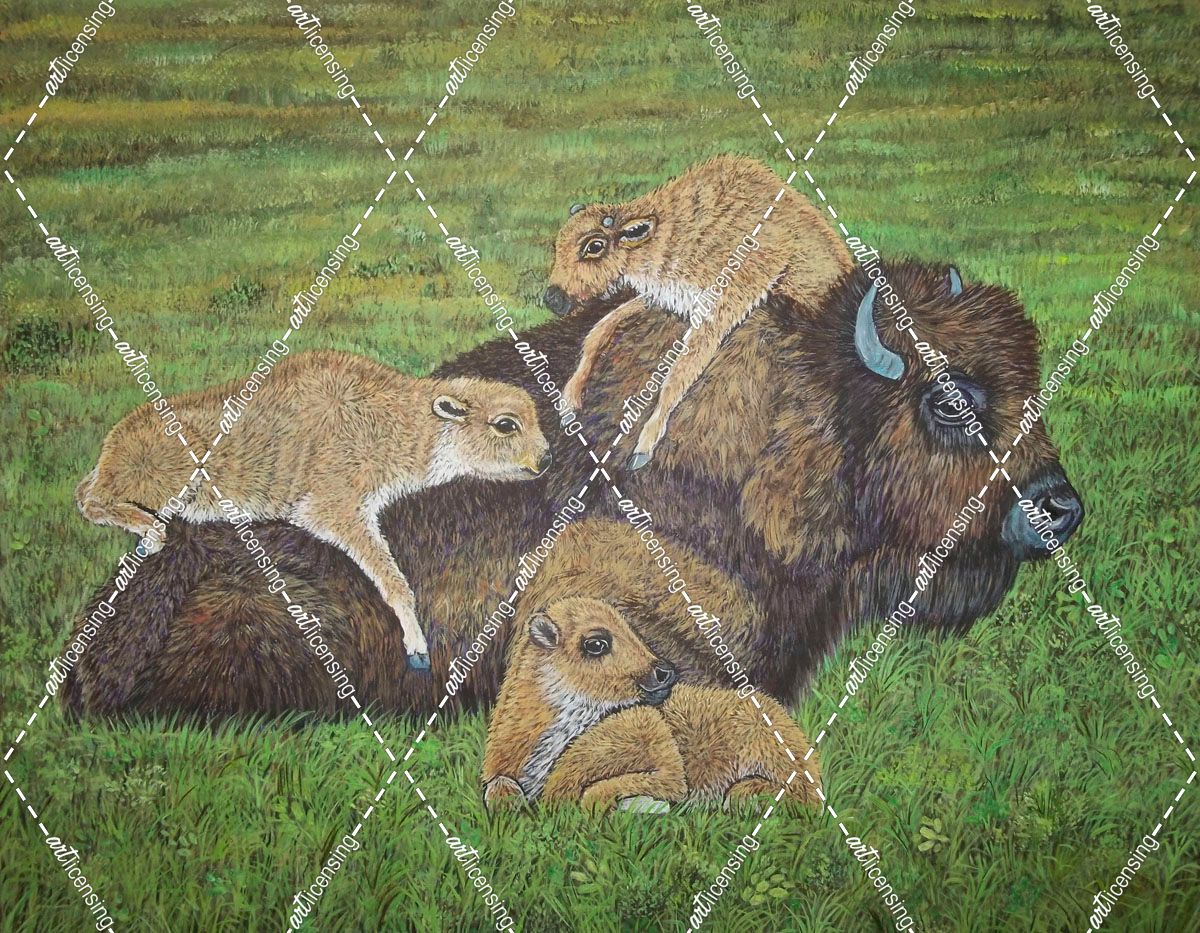 Resting Bison And Playful Calves